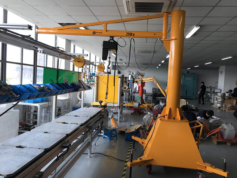 UPMAX250kg移動式懸臂吊,可以在車間隨意移動吊取重物。定柱式旋臂起重機合作了可靠性高的AMH型環(huán)鏈電動葫蘆尤其適用于短距離,運用頻頻,密布性吊運作業(yè),具有高效、節(jié)能、省勁、占地面積小,易于操作與修理等特色。環(huán)鏈電動葫蘆有起升和在橫梁上往復運行的功用,旋臂梁可由反轉設備上的的減速機股動滾輪進行反轉運動,電器操控箱裝置在環(huán)鏈葫蘆上。 本機操作通過手電門按鈕實現(xiàn)。手電門有八個按鈕,別離操控快升、快降、慢升、慢降、左右反轉及葫蘆小車的水平前后行走。留意:1、 操作時不得一起按下快慢按鈕和同一電機的橫豎轉按鈕 。